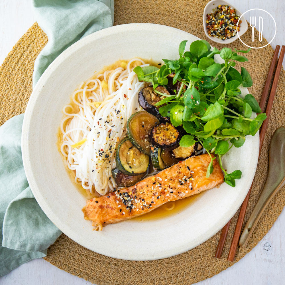 togarashi spice mix, rice vermicelli noodles, salmon fillets, tare, ginger, watercress, zucchini, gourmet eggplant