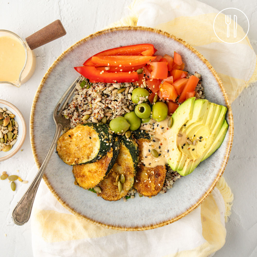 Organic tri-coloured quinoa tossed with fresh mint, served with fresh toppings, olives, crispy polenta-coated zucchini, and hemp and mixed seeds, finished with a drizzle of tahini-based harvest dressing.