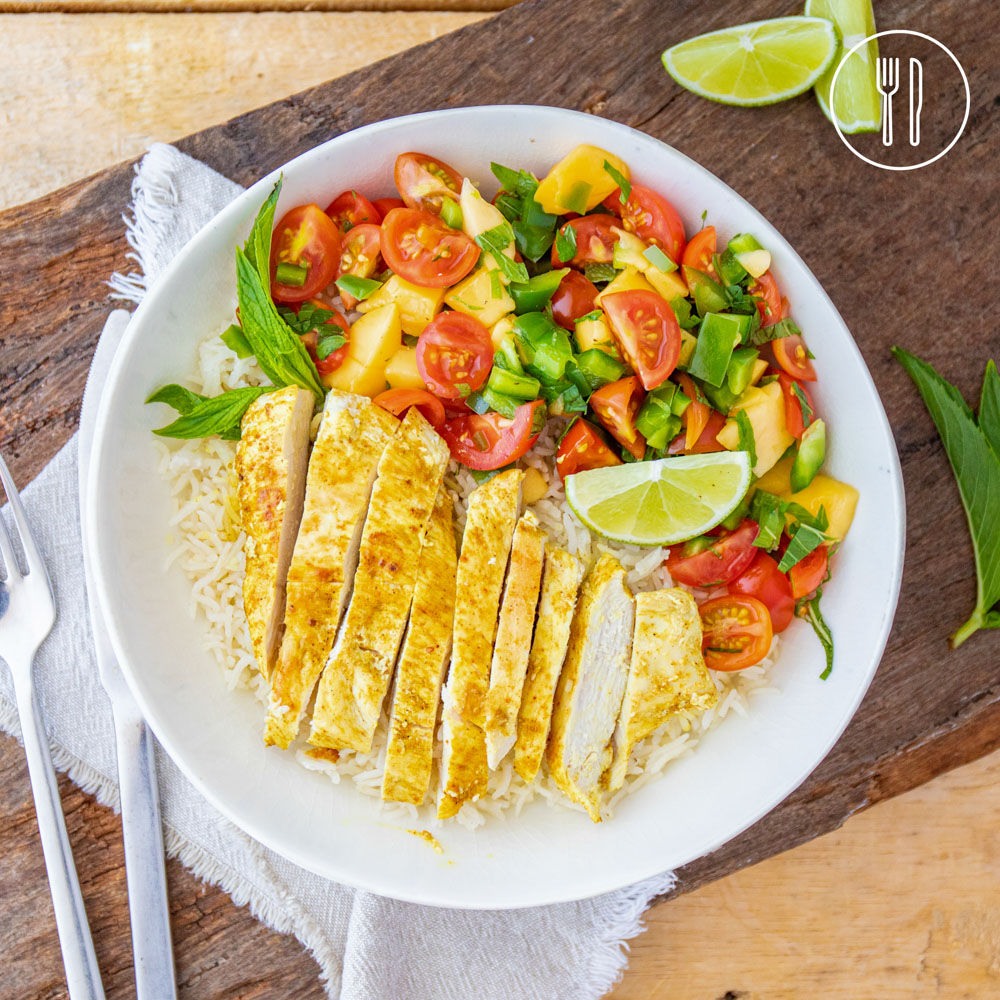 Creamy coconut rice with curry spiced chicken, topped with a fresh nectarine salsa with mint and lime. This dish favourite for families!
