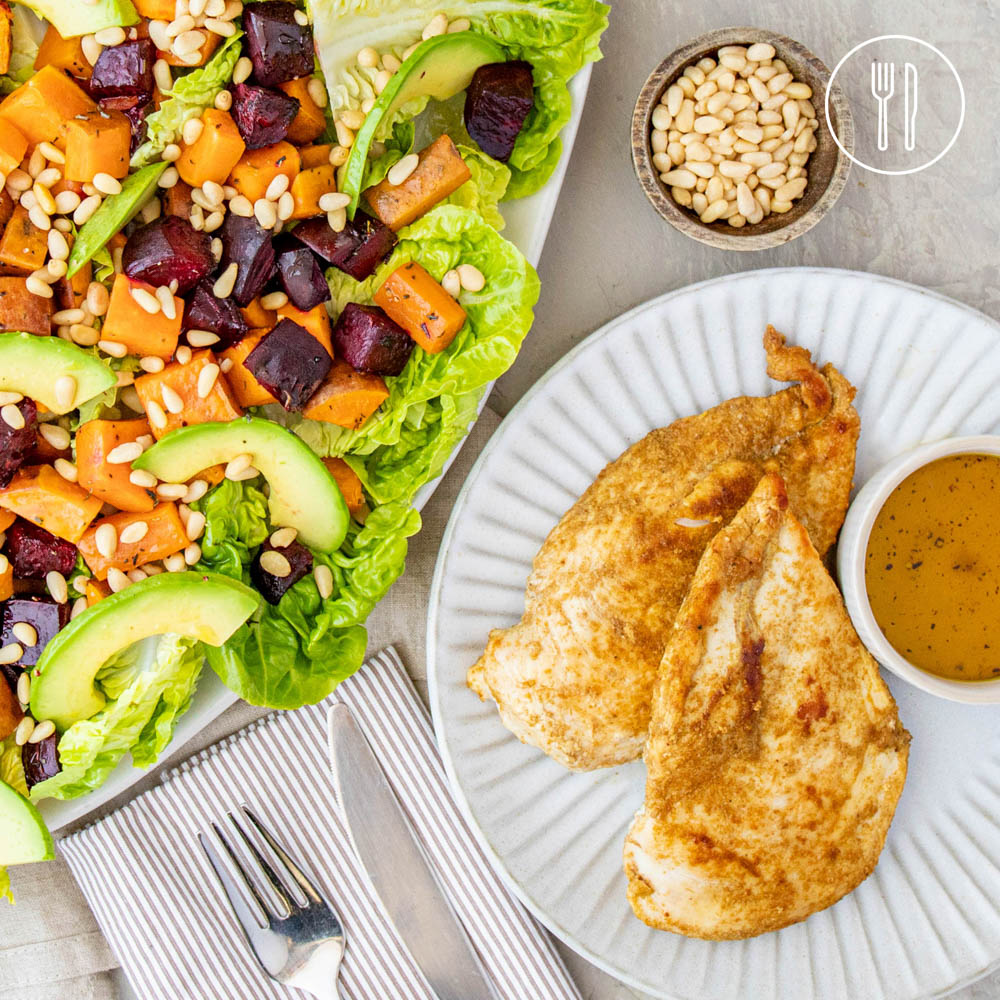 Cumin spiced chicken schnitzels with a rainbow roast sweet potato and beetroot salad, finished with avocado, pine nuts and a honey dressing.