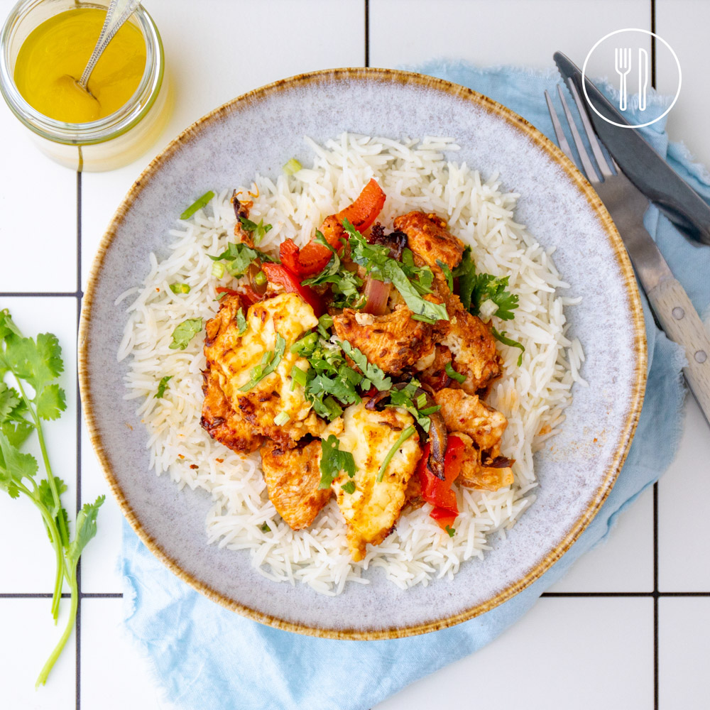 diced chicken breast, cumin seed spice mix, basmati rice, feta cheese, coriander, dill, red capsicum, lemon, red onion