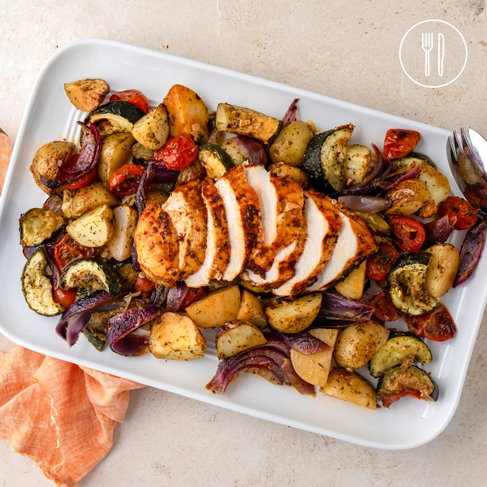 Juicy roasted chicken breast with golden baby potatoes, zucchini and cherry tomatoes.