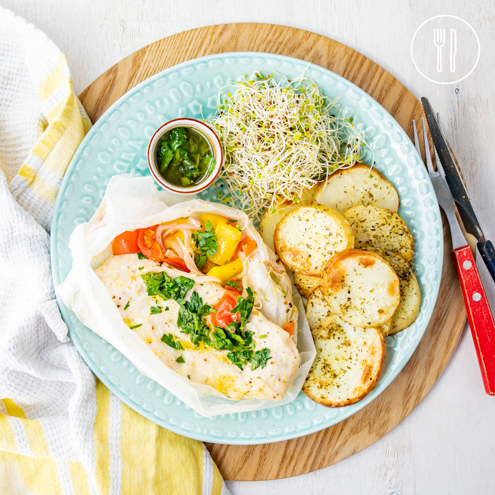 White fish fillets and greek vegetables baked in parcels, served with oregano roasted potatoes and fresh alfalfa sprouts.