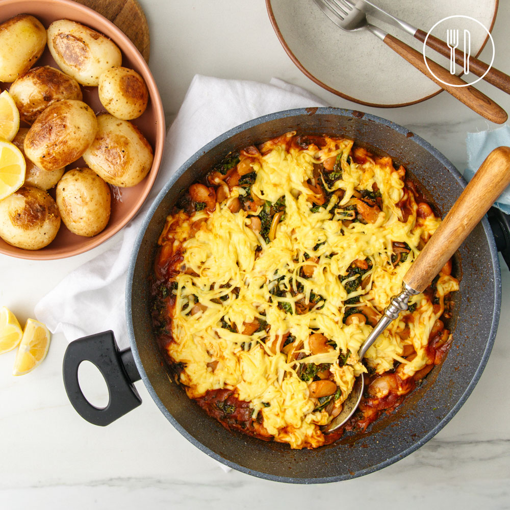 A hearty, one-pan dish inspired by classic Greek flavours. Butter beans and kale simmered in a tomato base with capsicum, garlic, topped with melty almond cheddar and baked until golden.