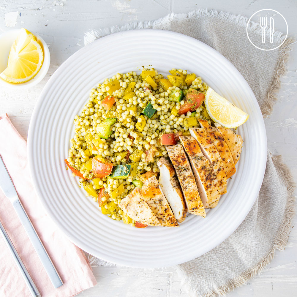 A colourful pearl couscous medley with tomatoes, cucumber and capsicum all tossed together with a cheesy basil pesto and served with grilled chicken schnitzels.