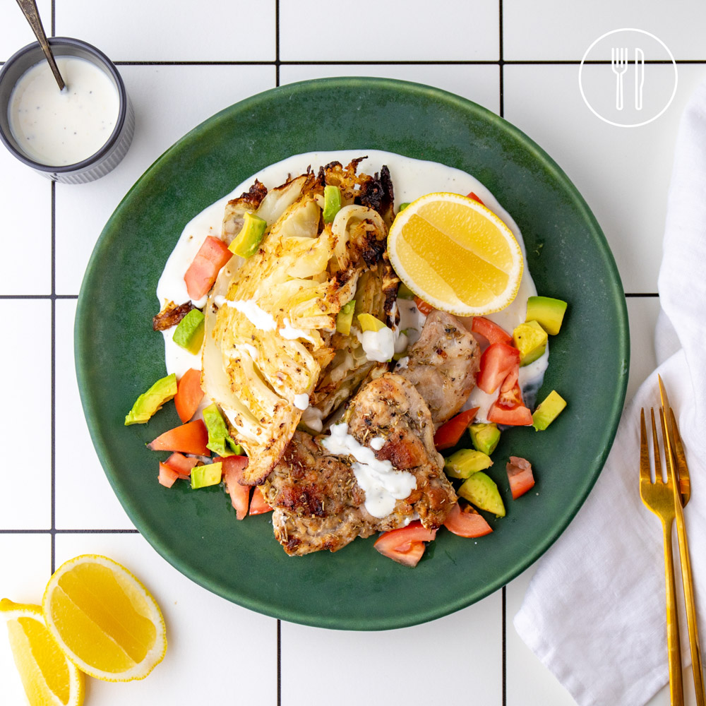 Herby grilled chicken thighs, served with a roasted cabbage wedge salad with fresh avocado and vegetables, over a creamy and flavourful lemon and garlic yoghurt sauce.