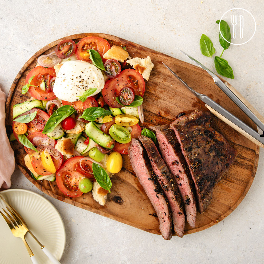 beef flank steak, ciabatta bread loaf, fresh mozzarella, basil, shallot, tomato, cherry tomato medley, zucchini, garlic clove
