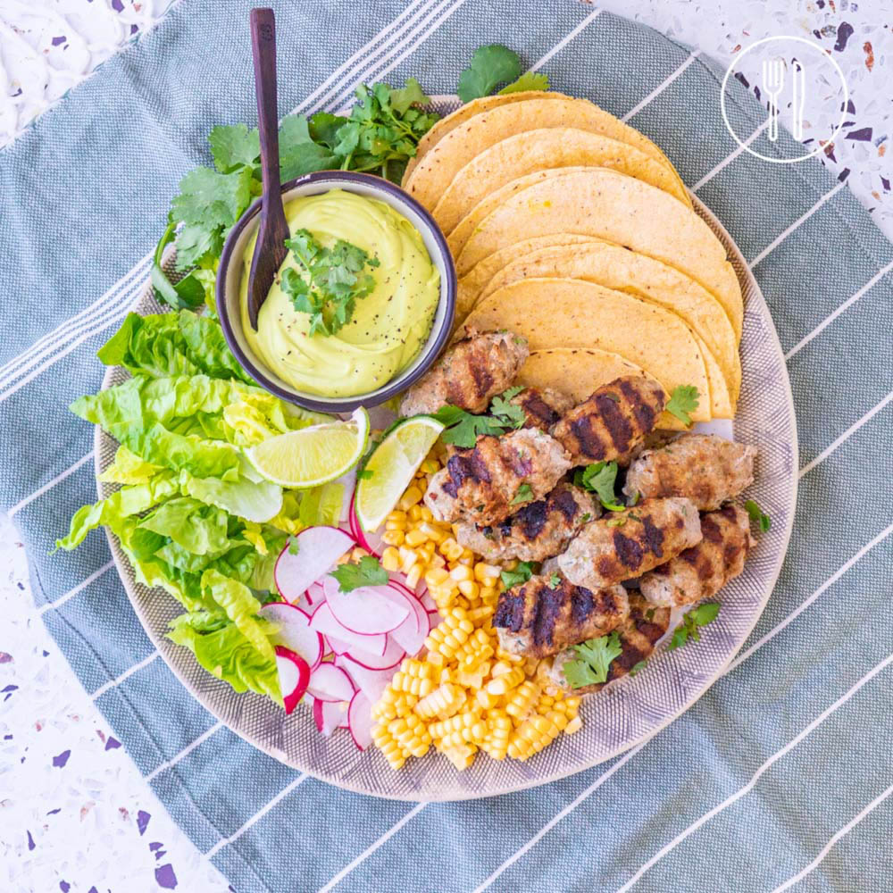 Pork koftas with a whipped avocado sauce, zingy lime juice, fresh corn kernels, crunchy radish and naturally gluten-free corn tortillas.