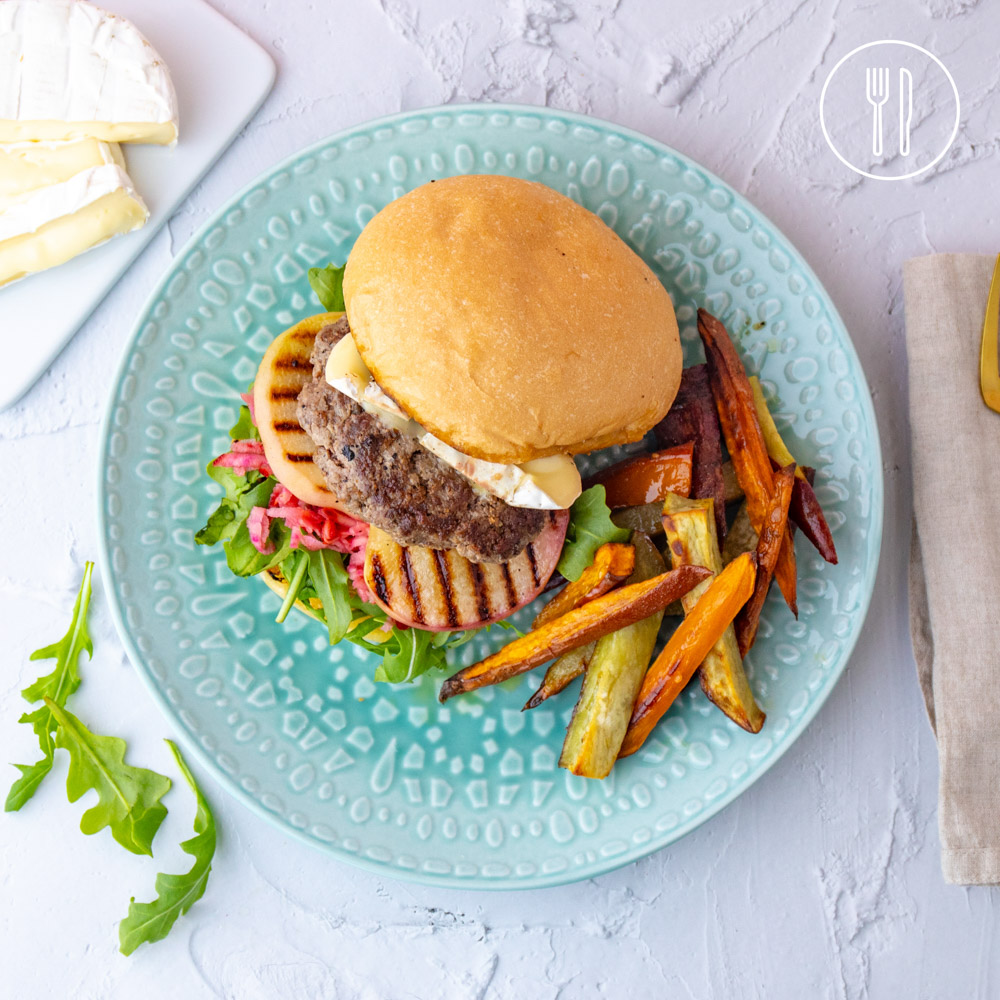 If you crave a burger, but a regular burger just won’t do, look no further! Packed with a juicy beef patty, barbecued stone fruit, pickled beetroot, creamy brie cheese, and fresh rocket leaves, served with rainbow sweet potato wedges, these burgers will hit the spot.