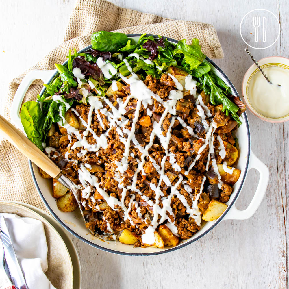 Oven roasted cubes of spiced potato, topped with a simmered tomato harissa beef, finished with a drizzle of yoghurt and served with a side of fresh mesclun leaves.