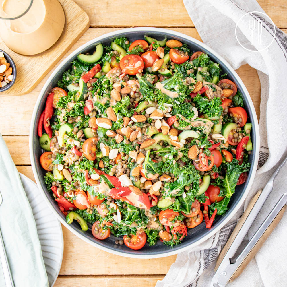 Puy lentils with lemon, garlic and cumin, tossed with sautéed kale, fresh cucumber and tomato. All finished with a creamy coconut yoghurt, harissa dressing and chopped almonds.