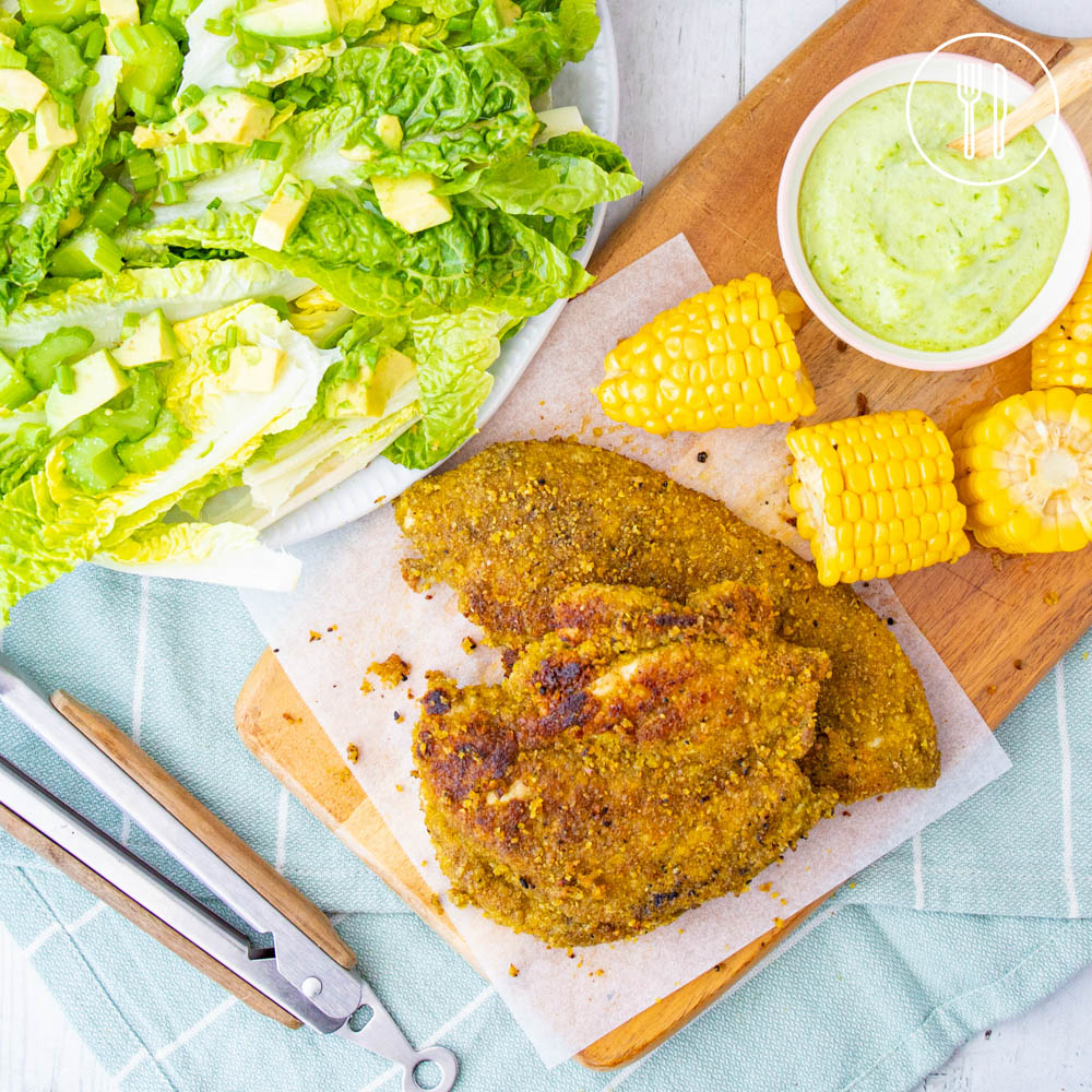 Chicken schnitzels coated in flavourful herb and garlic lupin crumbs, served with corn cobettes, fresh and crunchy green salad and a herbed jalapeño aioli.