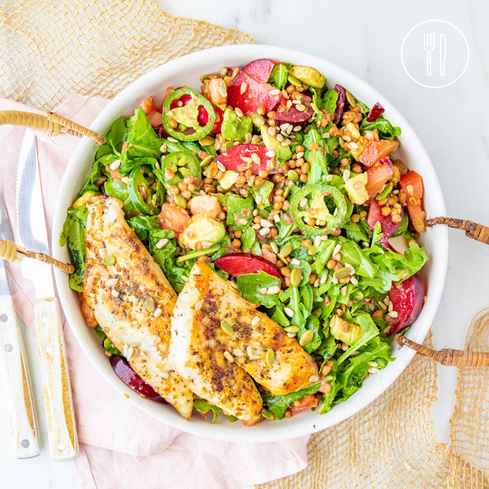 White fish fillets served with a fresh and vibrant salad of plum, jalapeño, brown lentils and balsamic dressing with crunchy seed topping.