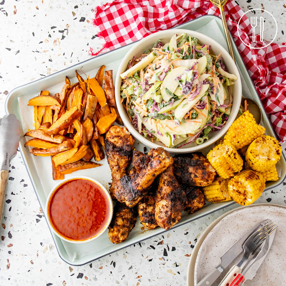 Chicken drumsticks barbecued with buffalo spice, served with barbecued corn, roasted sweet potato wedges, creamy coleslaw and home-made barbecue sauce.