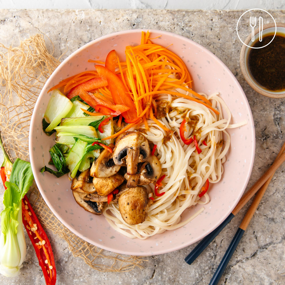 A fresh and fast noodle bowl with egg noodles, sautéed mushrooms, Asian greens, and colourful veggies, finished with a zesty honey ginger dressing.