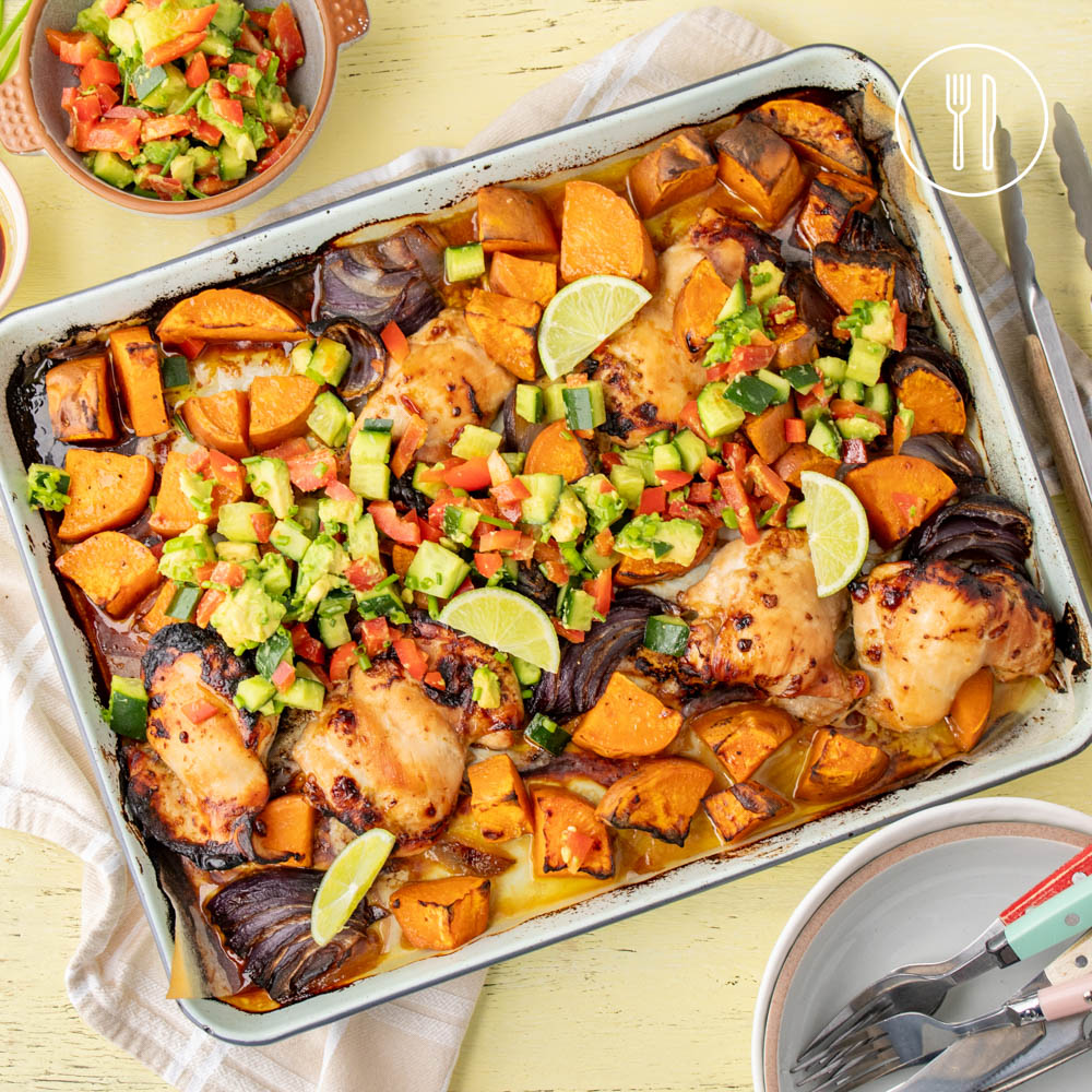 Chicken thigh fillets roasted with a honey lime marinade until sticky, with sweet potato and a fresh colourful avocado salsa.