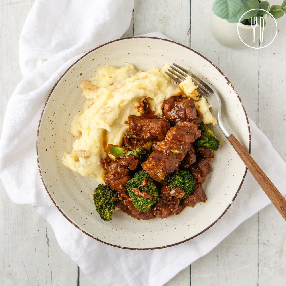 Tender pork bites coated in a savoury honey mustard glaze, served over creamy mashed potatoes with sautéed broccoli for an easy family favourite.