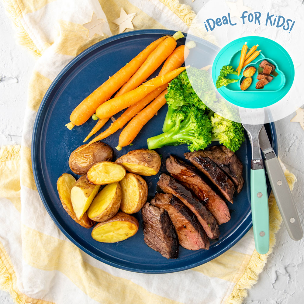 beef steaks, honey shot, butter, broccoli, Dutch carrots, baby blue potatoes