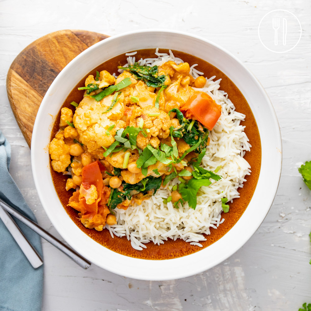 Vibrant flavours of India in a rich “buttery” tomato sauce using one of our favourite curry pastes, featuring cauliflower, chickpeas and spinach, all served on basmati rice.