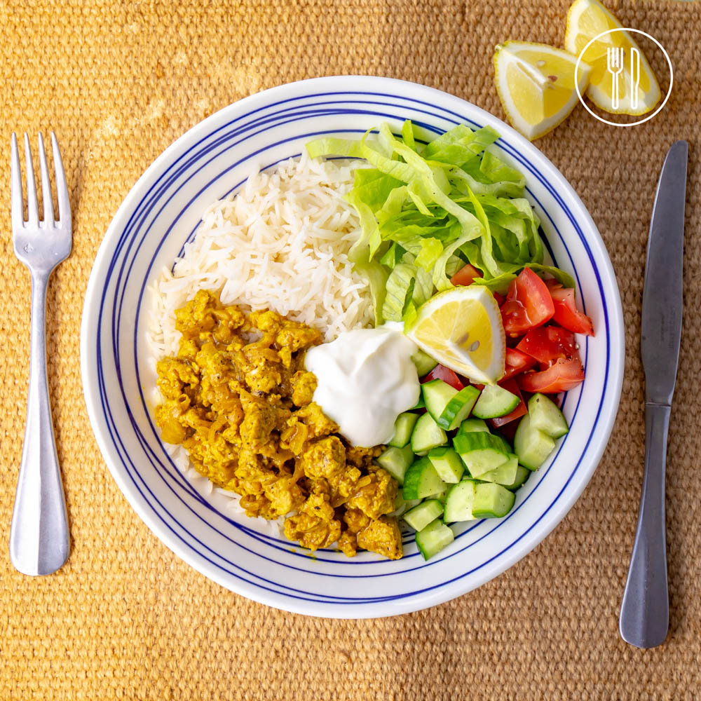 Flavourful curried chicken, served in a quick and easy bowl with basmati rice, fresh lettuce, tomato and cucumber, and Greek yoghurt to dollop on!