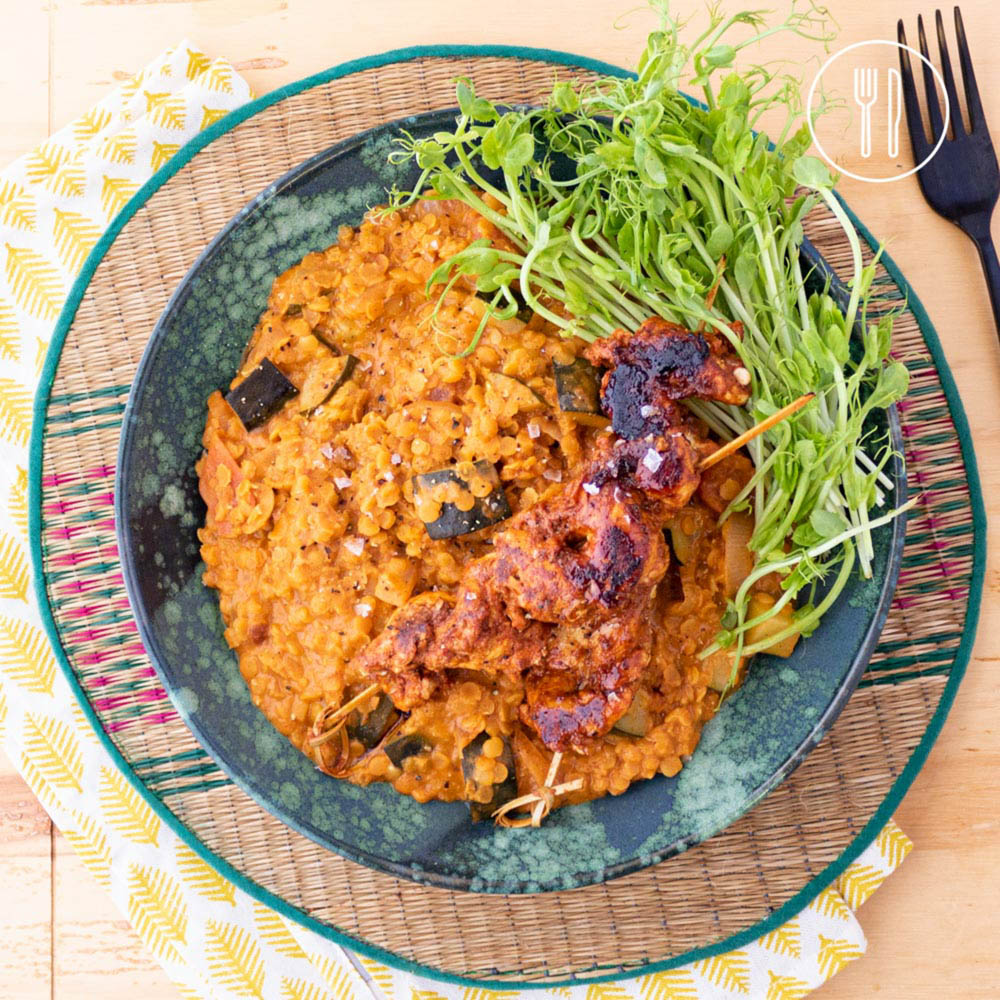 Heart-warming and delicious Indian flavoured red lentil dhal, served with spiced chicken skewers and fresh sprouts.
