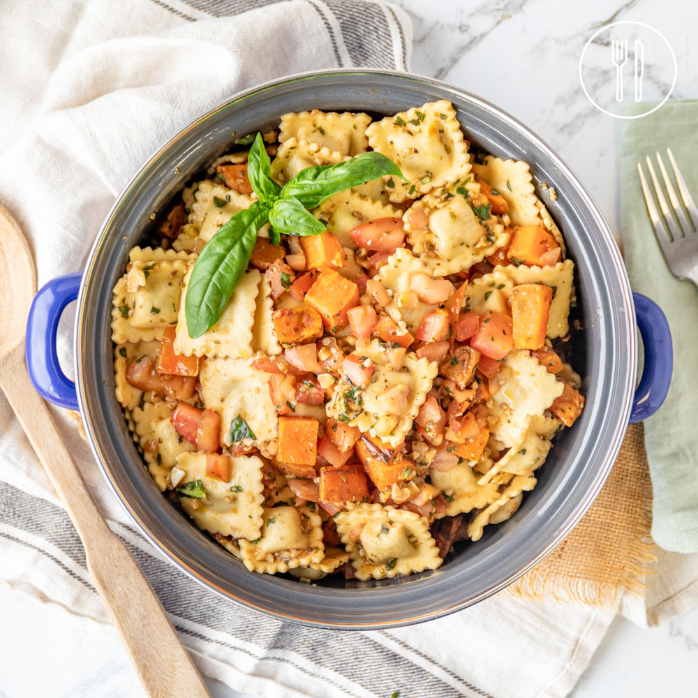 Fresh pasta pockets of Italian pork sausage, tossed with roast sweet potato and a super quick, balsamic tomato and basil pesto, all prepared on the chopping board!