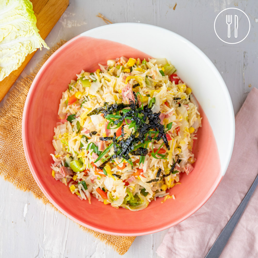 A delicious garlic fried rice with ramen seasoning, buttery sweet corn, cabbage and crispy free-range bacon.
