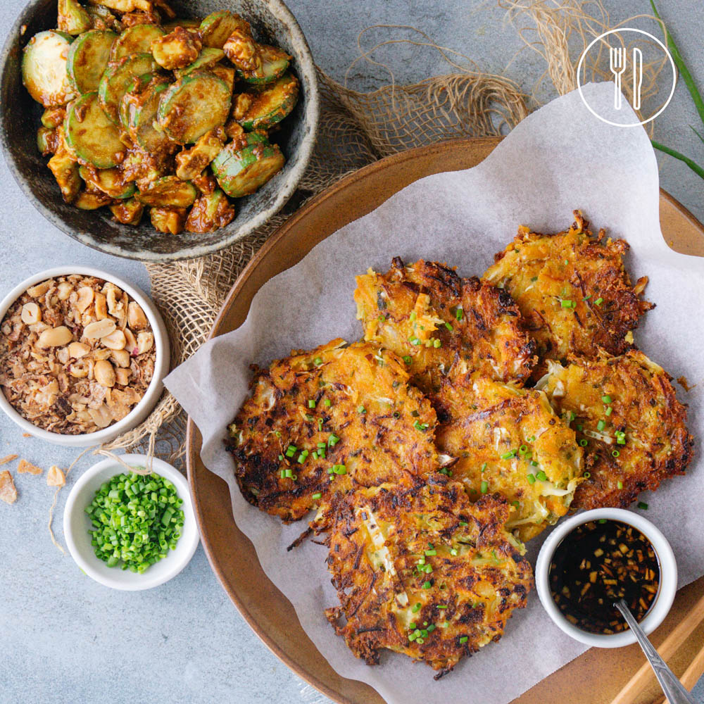 Korean pancakes get a plant-based twist! Made with a lentil batter, cabbage, carrot and chive, and served with a fresh cucumber and avocado salad and a ginger dipping sauce.
