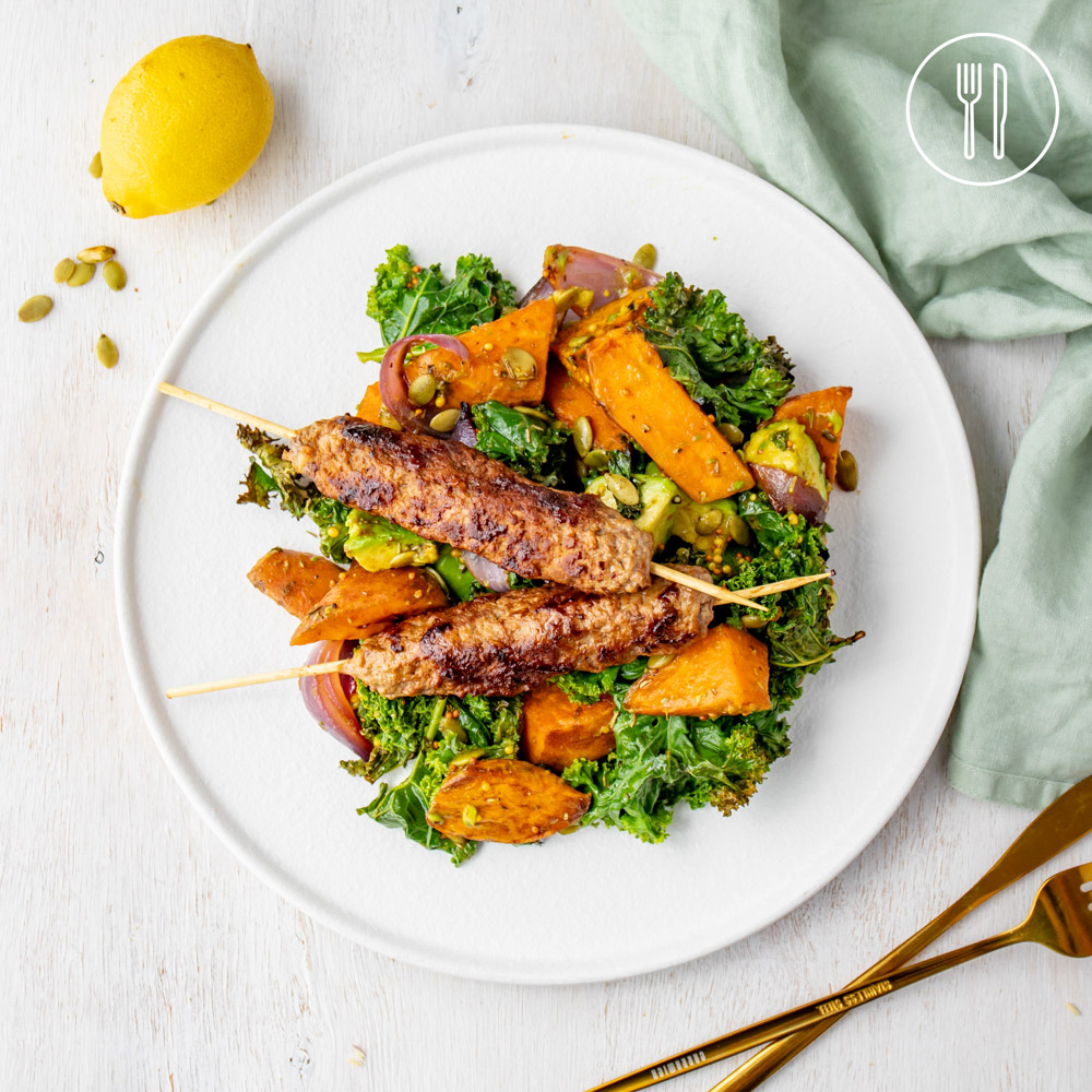 Flavourful lamb kebabs served over a roasted sweet potato and crispy kale salad with a lemon and mustard dressing and toasted pepitas.