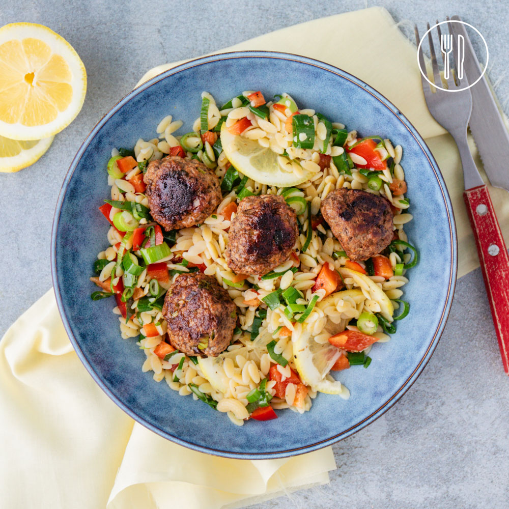 Zesty lamb meatballs paired with a fresh and vibrant risoni salad, featuring crisp capsicum, spring onions, and lemon dressing