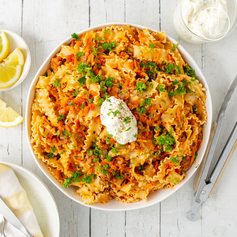 A family-friendly twist on classic ragĂș, made with tender lamb mince, grated vegetables, and mild spices in a rich tomato sauce. Served over pasta and finished with zesty ricotta and fresh parsley.