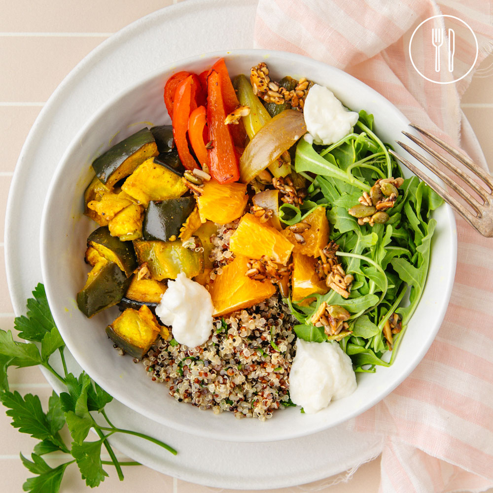 A vibrant plant-based bowl layered with spiced roasted vegetables, herbed quinoa and fresh citrus, finished with crunchy sweet chilli cumin clusters and creamy skordalia.