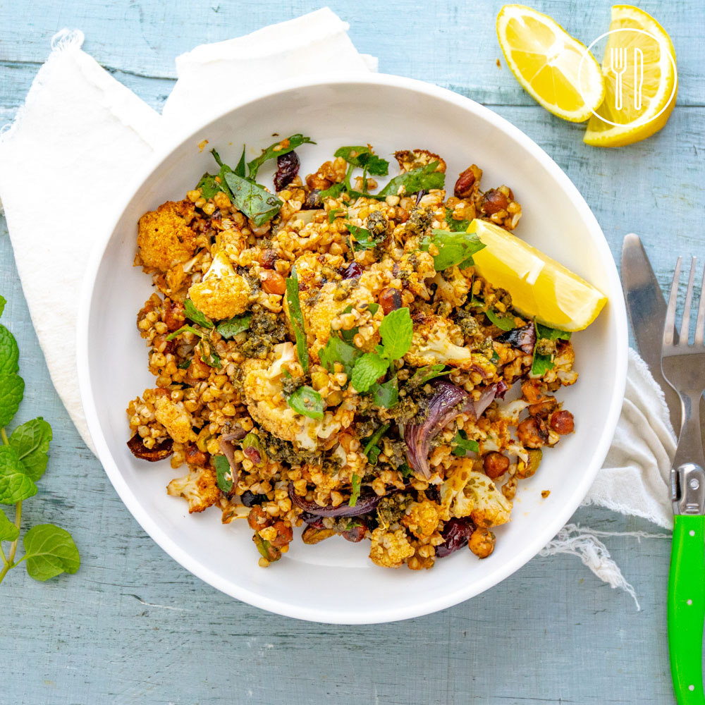 Roast cauliflower and crispy chickpeas with warm flavours of cinnamon and cardamom tossed with buckwheat, mint and a lemon maple dressing with pops of sweetness from dried cranberries.