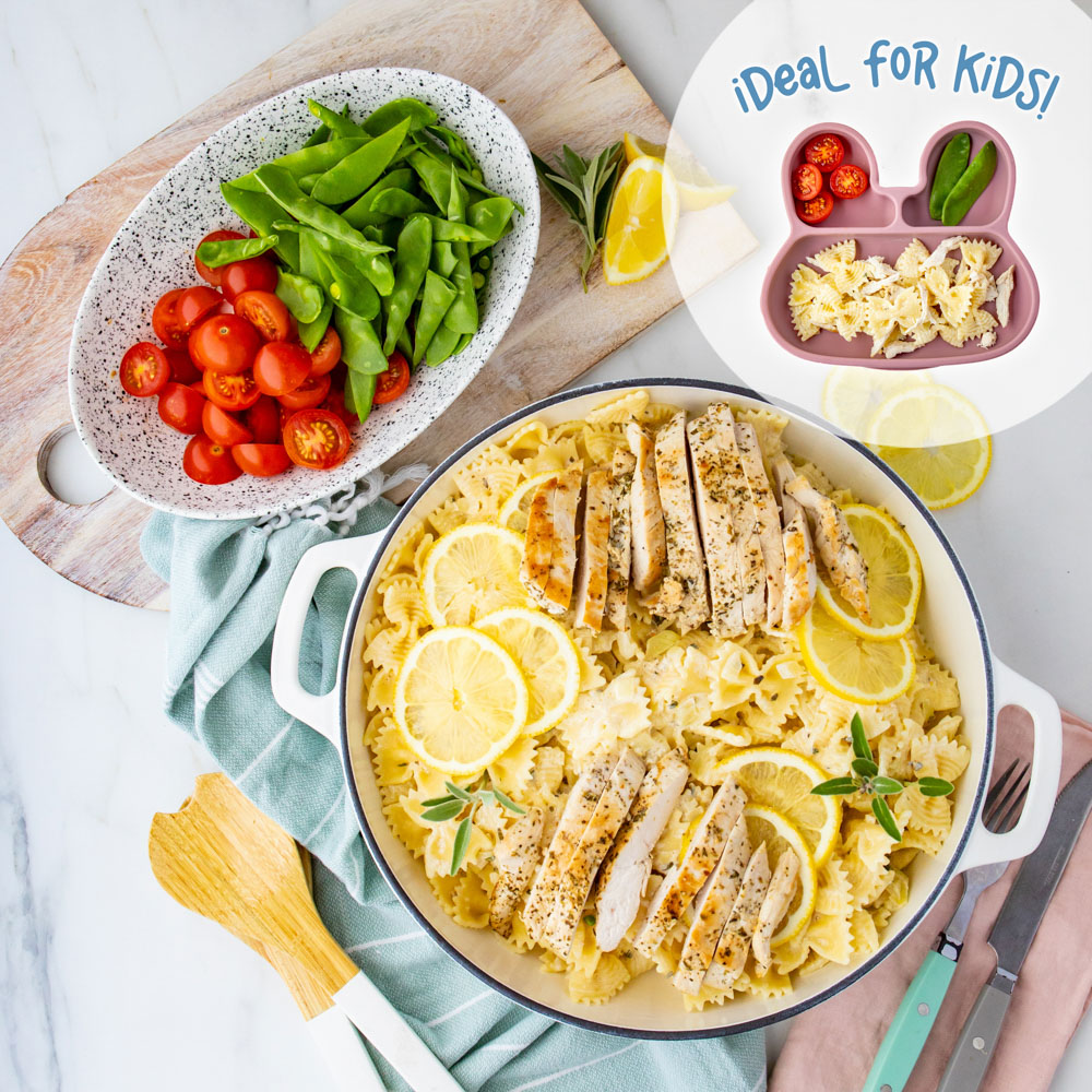 Golden sliced chicken served with a light creamy lemon pasta topped with cherry tomatoes and crunchy snow peas.