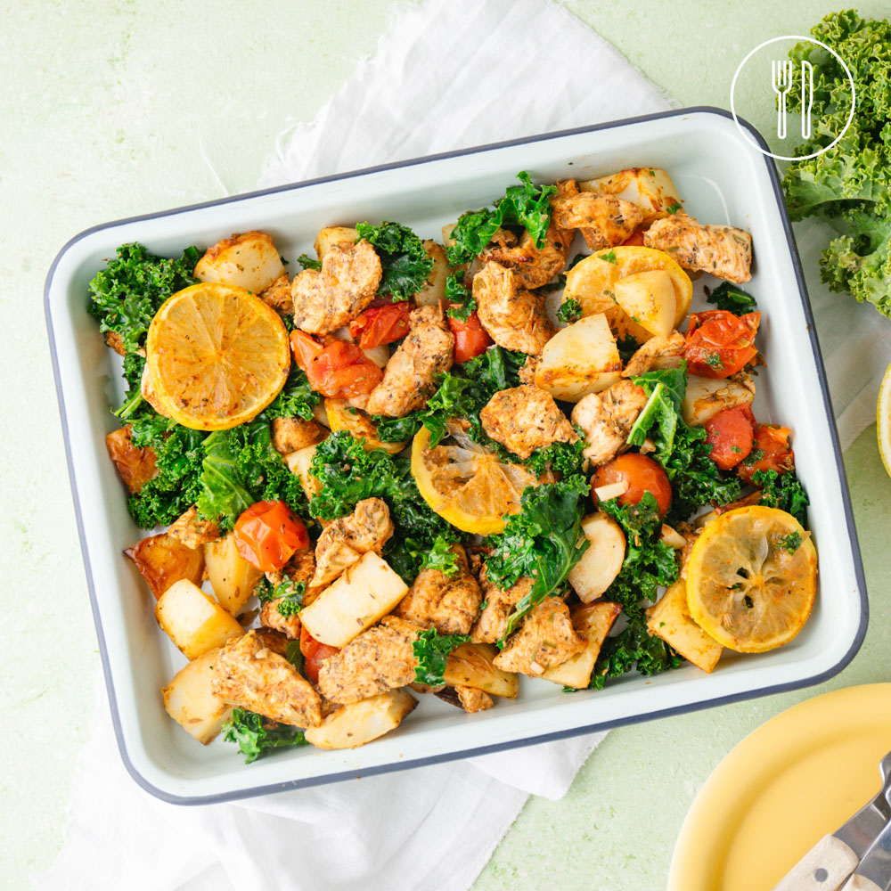 Zesty lemon and garlic-roasted chicken with golden potatoes, blistered cherry tomatoes, and tender kale, all baked together for a bright and flavourful meal.