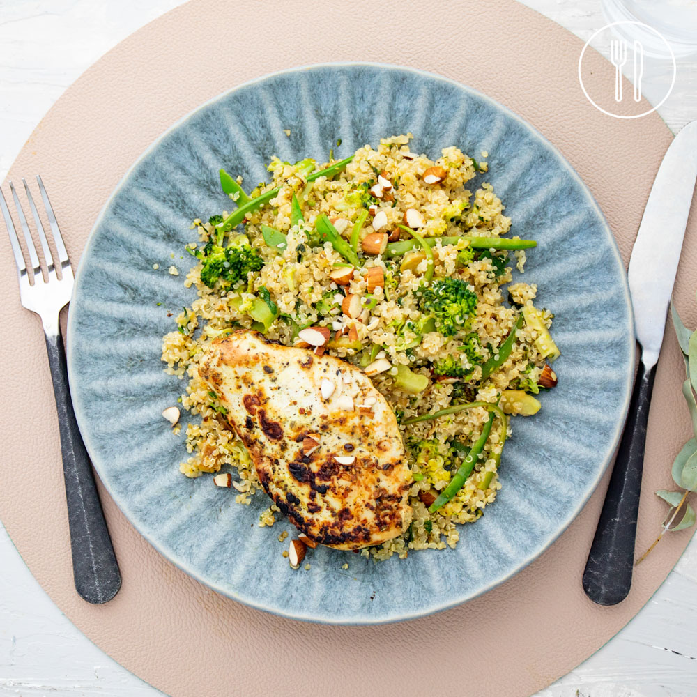 Chicken schnitzels cooked in lemon pepper, served over quinoa and sautéed green vegetables with a lemon dressing and almonds.