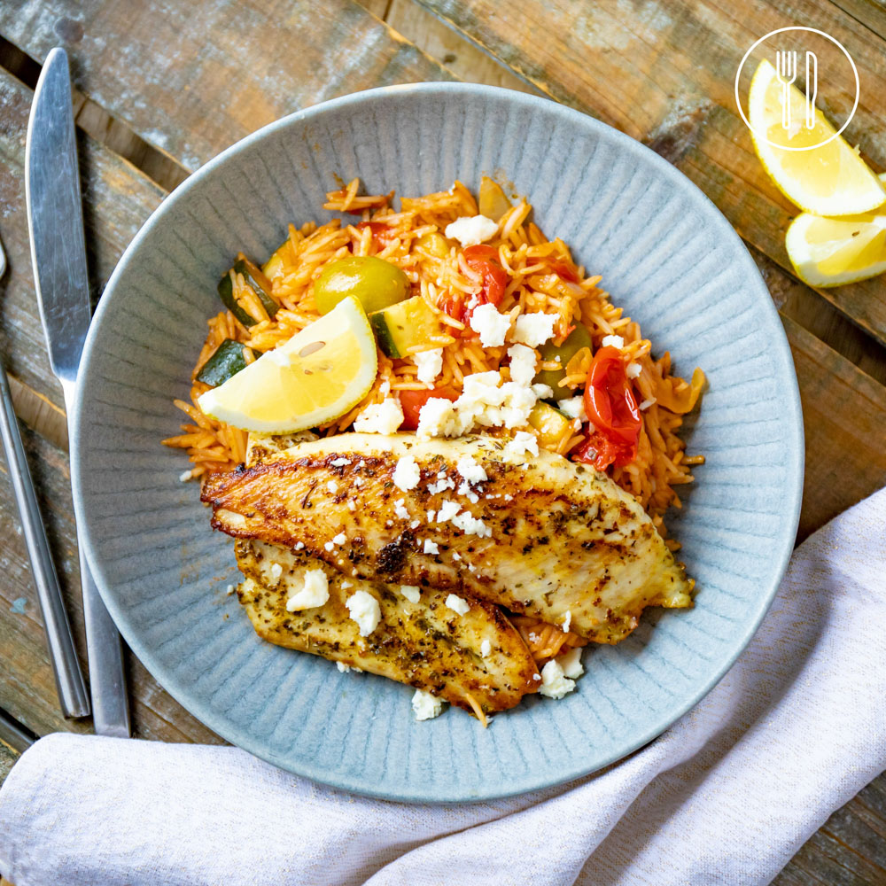 Mediterranean style rice cooked in stock with tomatoes, zucchini and olives, served with seared lemon fish and finished with crumbled feta cheese.