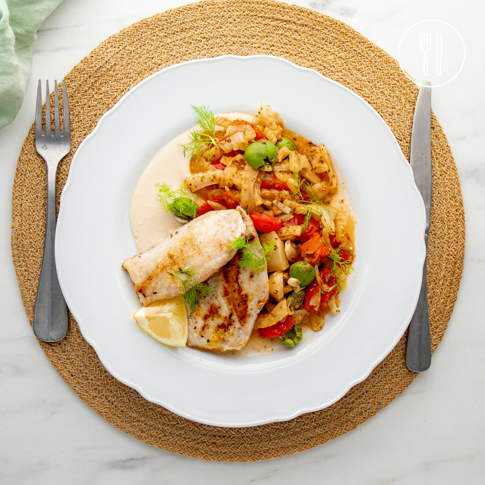 This one-pan dish is bright and delicious with white fish fillets pan-fried with lemon zest, served with sautéed Mediterranean vegetables and Sicilian olives over a creamy white bean puree.