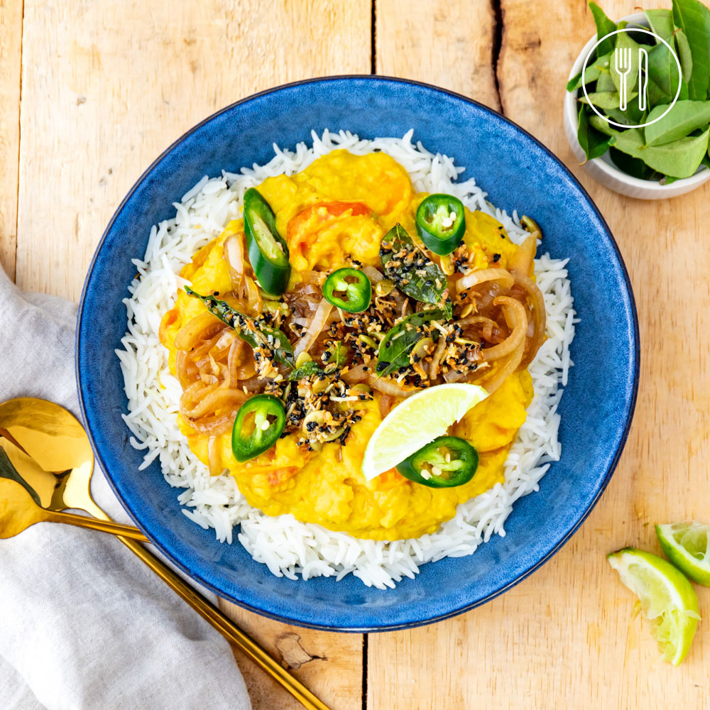 Lentil dhal spiced with island curry spice mix from WA locals, GH Produce, served over fragrant basmati rice with caramelised onions, crispy curry leaves and toasted seed and coconut mix.