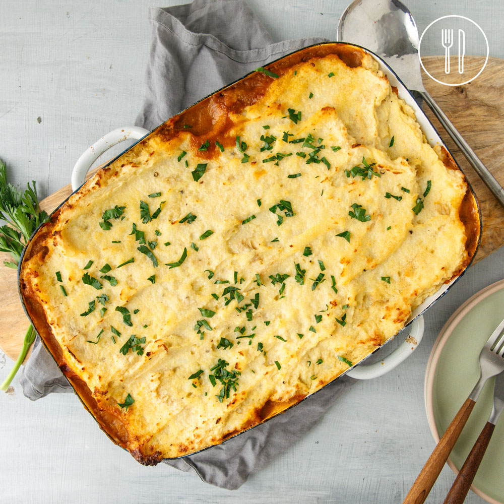 Layers of warmly spiced lentils, roasted eggplant and tender vegetables are topped with a creamy, savoury potato mash and baked until golden.