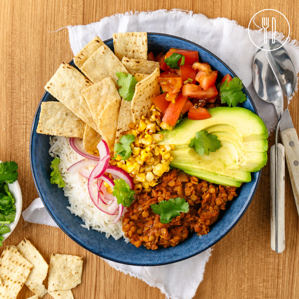 A colourful, Mexican-inspired bowl loaded with spiced lentils, fluffy rice, charred corn, creamy avocado, and crispy tortilla strips. A fresh and vibrant way to shake up your dinner routine.