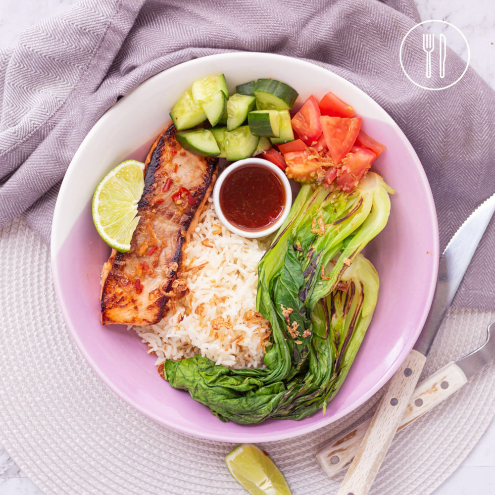 Salmon fillets cooked with a sweet chilli and lime dressing, served over coconut rice with charred Asian greens and fresh toppings.