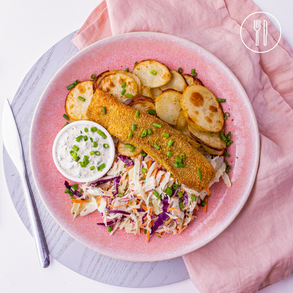 Fresh salmon fillets crusted in herby lupin crumbs, served with roasted potatoes and a chive coleslaw. The perfect nourishing and delicious solution for fish and chips!