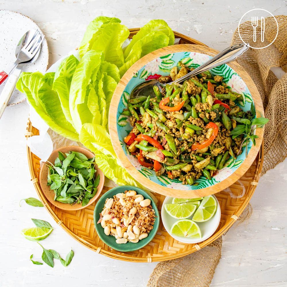 Thai style pork mince with red capsicum and beans cooked in a massaman curry sauce and served in crispy lettuce cups finished with fragrant Thai basil, crunchy peanuts and fried shallots.
