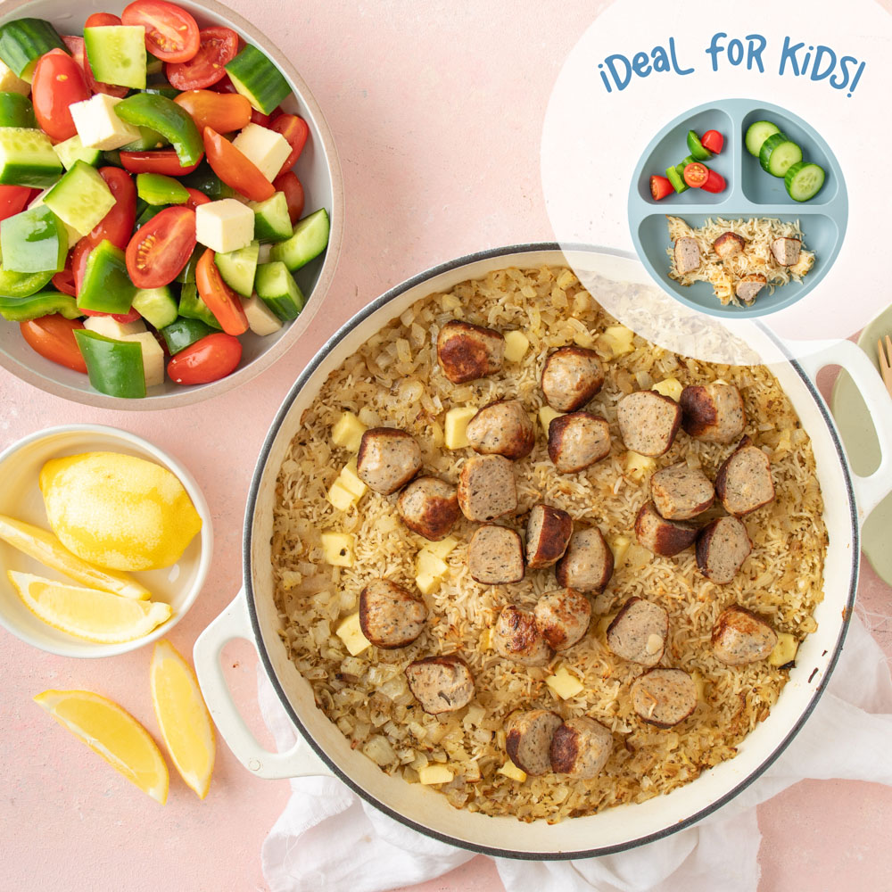 Juicy pork meatballs served with lemony baked rice and a crisp Greek style salad - a bright and easy weeknight meal.