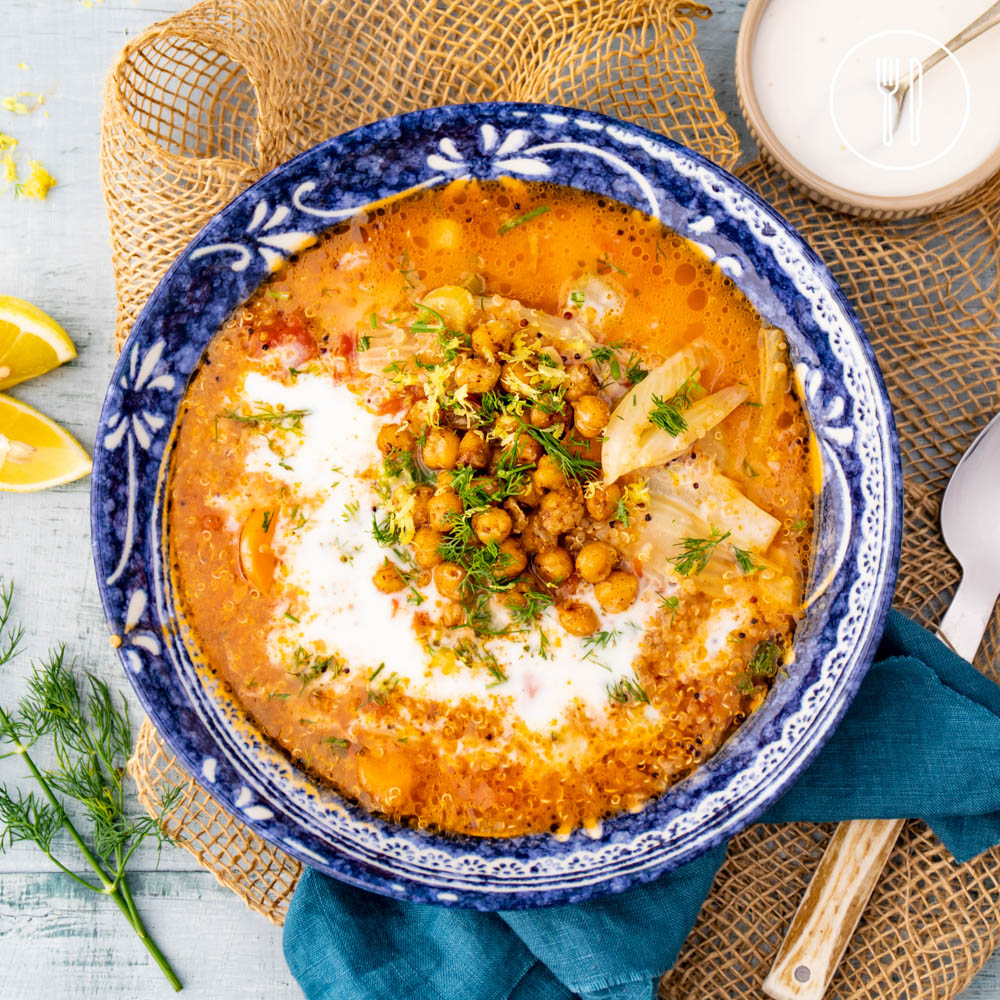 Mixed quinoa cooked in a rich and comforting tomato broth with fennel, lemon and garlic. This soup is served with a crispy, spiced chickpea topping and finished with fresh dill for maximum flavour.