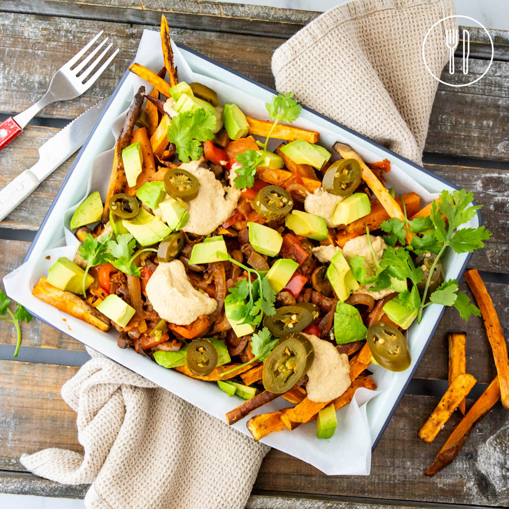 Sweet potato fries, loaded with sautéed button mushrooms and veggies, topped with home-made cashew queso, diced avocado and slices of pickled jalapeño.