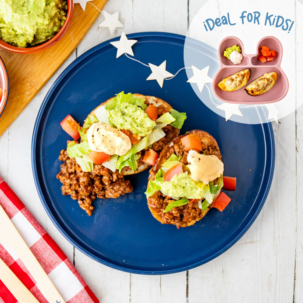 Stuffed potato boats with Mexican style beef, fresh salad ingredients, mashed avo, mild salsa and a dollop of sour cream.