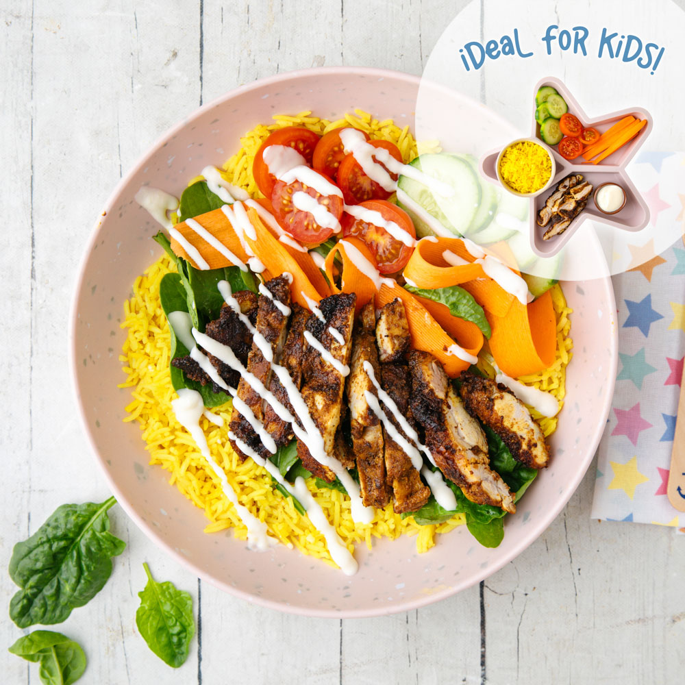 Middle Eastern spiced chicken served on fluffy golden rice, topped with fresh crunchy veggies and finished with a creamy garlic drizzle.