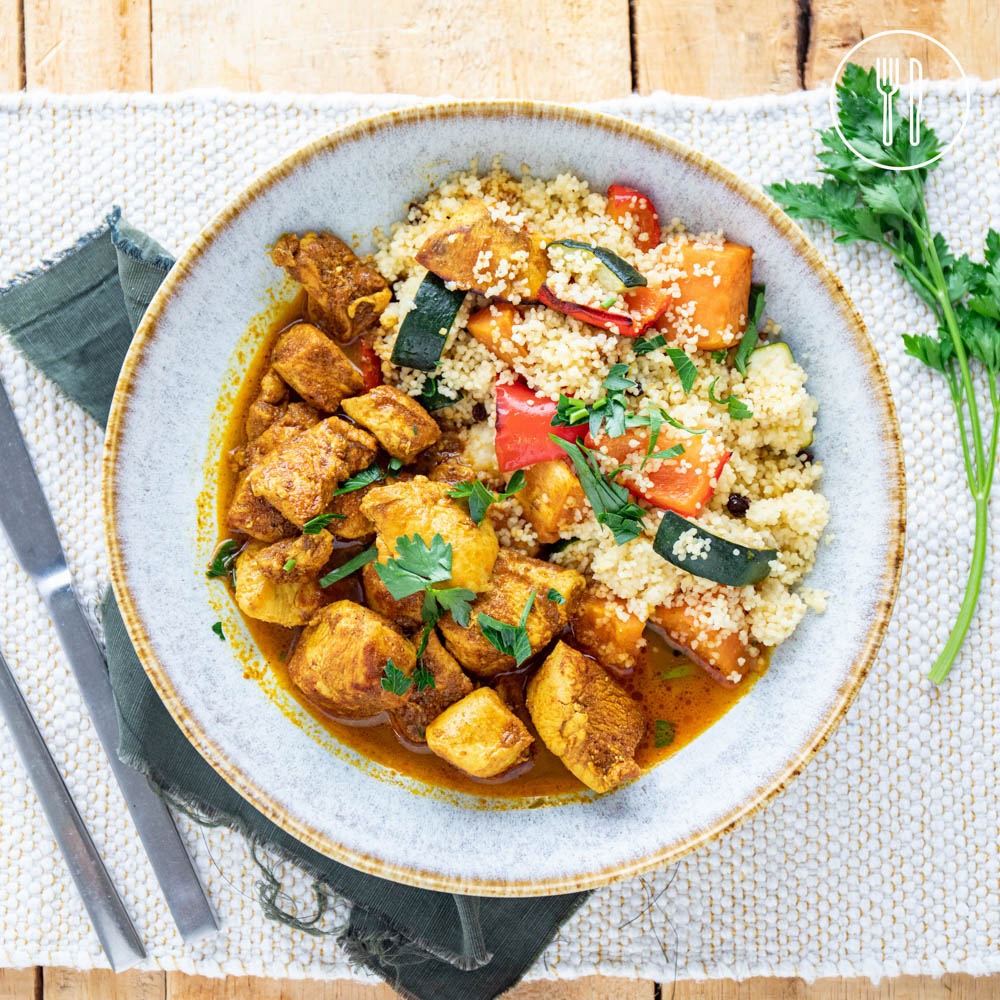 Diced chicken breast cooked in a flavourful blend of orange and Moroccan spices served alongside fluffy couscous tossed with oven-roasted vegetables and finished with parsley.